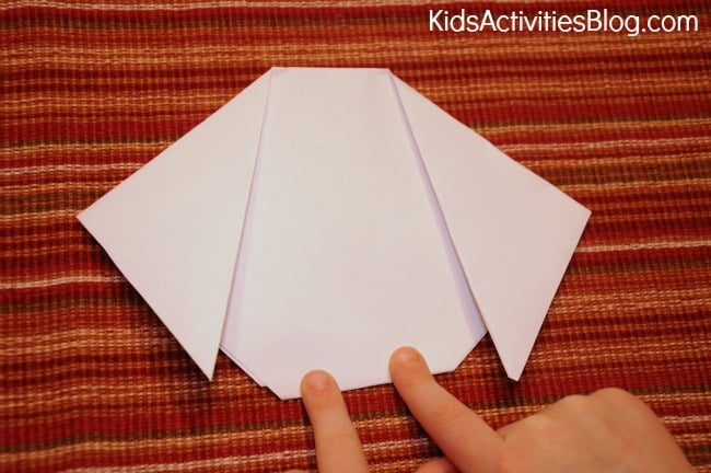 Next, fold the big center point under to form the dog’s chin. There you go! Your child has just made a dog by just folding paper into various triangles.