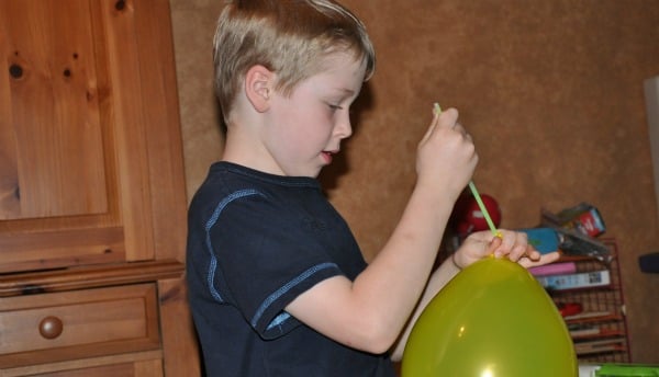 Once the balloon was inflated, my son wet the tip of the glow stick and wiggled it down into the balloon while holding the open end of the balloon tightly closed around the stick to keep the air from escaping.